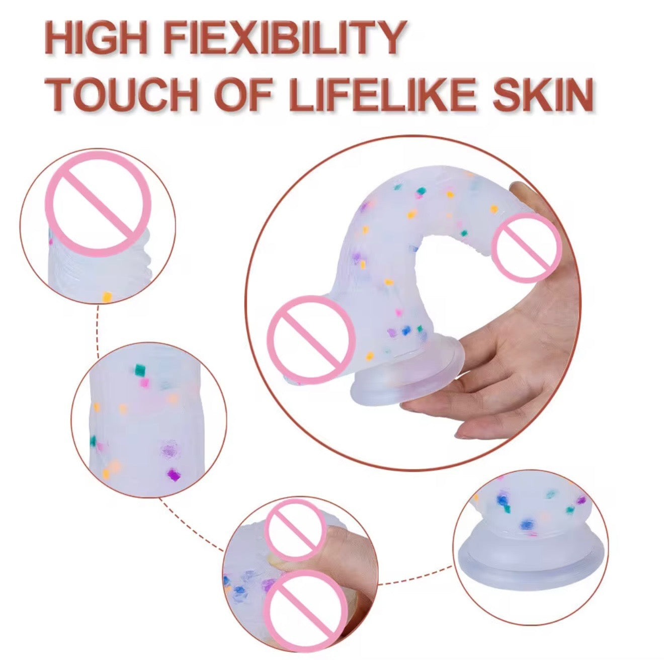 Say hello to your new party starter: the Confetti Crave – Rainbow Fantasy Dildo. This vibrant, clear dildo is packed with colorful confetti-style accents, turning every session into a celebration of pleasure. Its realistic shape, textured veins, and strong suction base offer both visual stimulation and deeply satisfying sensations.